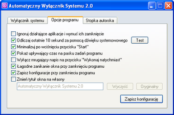 Opcje zmiany tytuł okna programu na własny oraz możliwość ustawienia łagodnego zanikania okna programu przy jego zamknięciu, są zbędne. Podczas naszych testów nie zadziałało też odliczanie ostatnich dziesięciu sekund przed zamknięciem systemu za pomocą sygnału dźwiękowego.